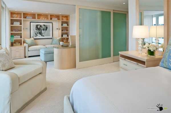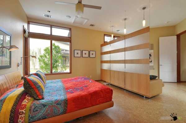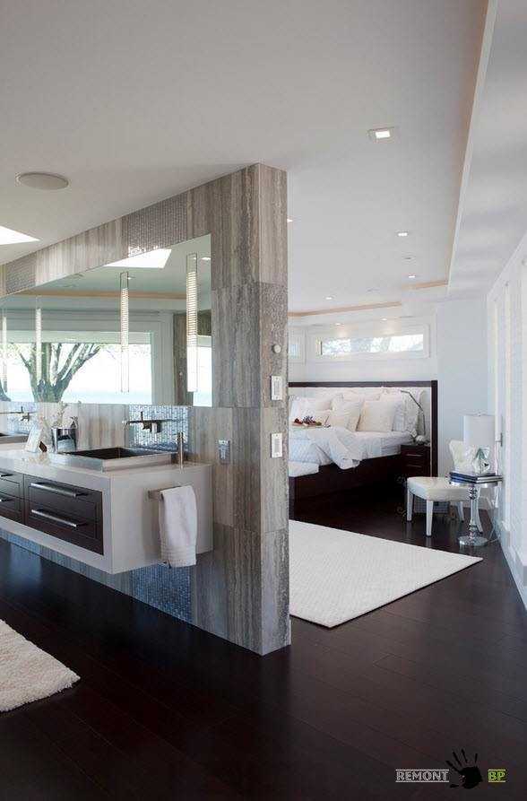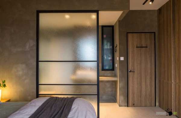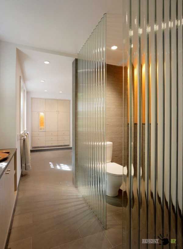 Рифленое матовое стекло позволяет проникать свету, но при этом практически полностью скрывает то, то происходит за перегородкой. Для отделения зоны ванной комнаты, расположенной в спальне такая конструкция будет практичным и функциональным дизайнерским решением.