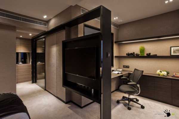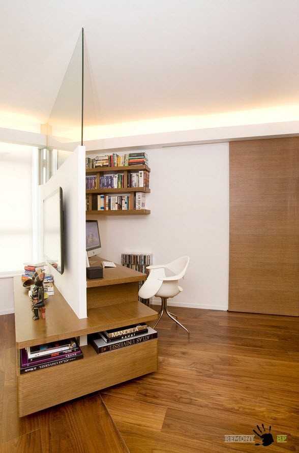 Схожий вариант комбинированной перегородки позволяет создать целый комплекс из систем хранения, размещения видео-зоны с одной стороны и письменного стола с другой. Такая конструкция будет уместна в гостиной, в рамках которой размещается кабинет.