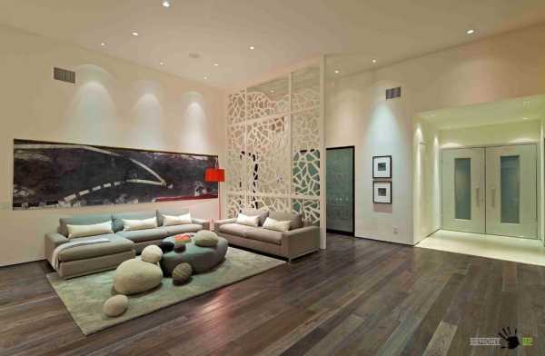 Использование стационарных перегородок в большом пространстве гостиной позволяет отделить зону столовой или библиотеки. В результате можно добиться желаемого уединения для определенных функциональных сегментов жилища.