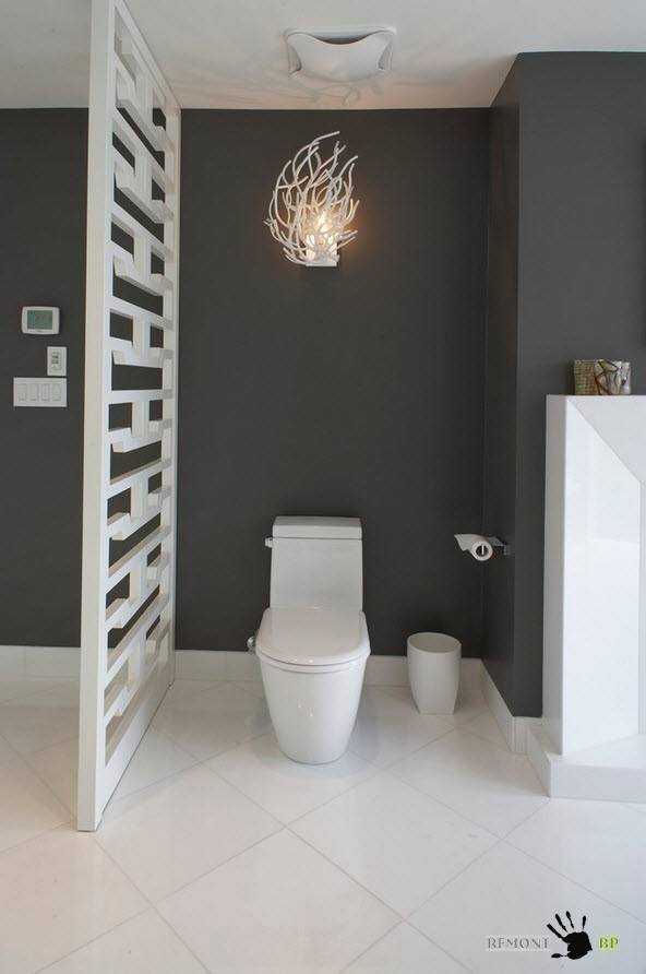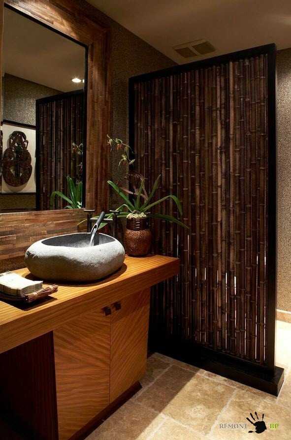 К оригинальным дизайнерским решениям для исполнения перегородок относится вариант использования бамбука, покрытого специальными лаками и антисептиками для долговременной эксплуатации в утилитарном помещении с высокой влажностью. Например, в санузле такой перегородкой можно отделить зону с унитазом от сегмента водных процедур.