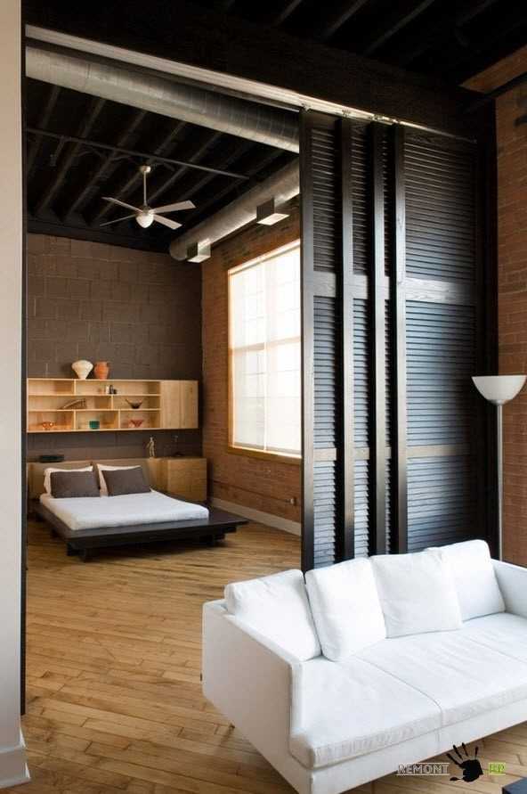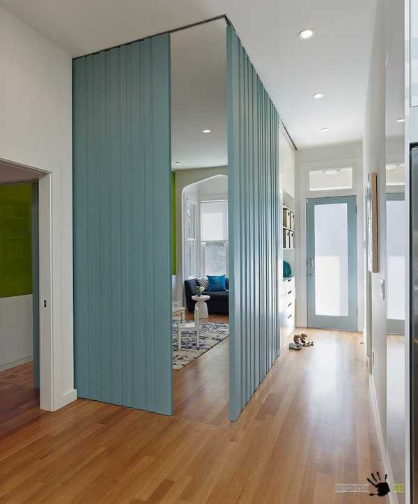 Еще один вариант подвижных перегородок — это складная конструкция—«гармошка». Она может как перекрывать слишком широкий межкомнатный проем, так и разделять комнату на два помещения, или же на две зоны.
