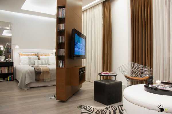 Поворотная конструкция из ДВП может выполнять сразу несколько функций – служить держателем для видео техники, использоваться как система хранения в зоне гостиной, а в сегменте спальни на такую перегородку можно повесить зеркало или картину, не говоря уже о том, что перегородку можно поворачивать в зависимости от ситуации.