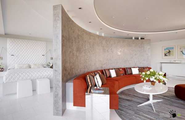 Перегородки из гипсокартона могут быть даже криволинейными. Отделка полученных плавных поверхностей осуществляется исходя из стилистических, цветовых и фактурных решений помещения.