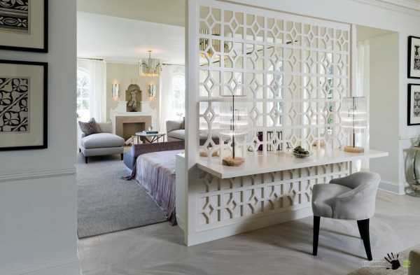 Деревянные перегородки могут быть оставлены в естественном цвете, а могут быть покрыты краской. Одним из самых популярных цветов окраса является белый. Кружевные конструкции белого тона легки и воздушны, но только внешне. На самом деле, подобные перегородки могут легко выдерживать вес открытых полок или даже консолей, выполняющих функции письменного стола, подставки или туалетного столика (в зависимости от функционального предназначения комнаты).