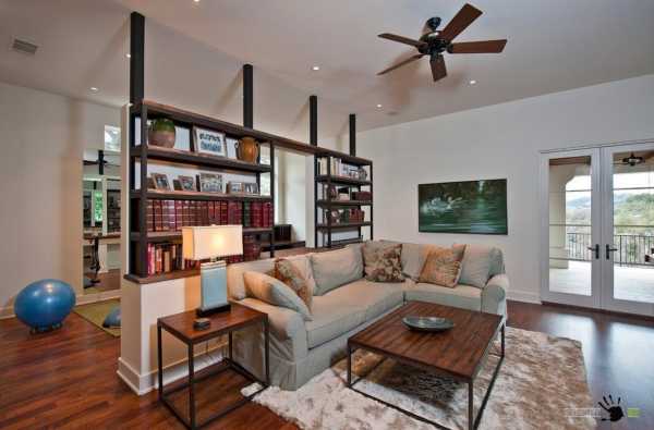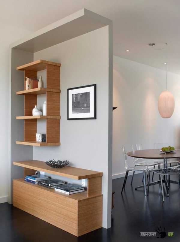 Перегородки-стеллажи невероятно популярны ввиду своей функциональности. Открытые или комбинированные полки могут размещаться как от самого пола, так и на некотором расстоянии от него – в зависимости от расположения меблировки в функциональной зоне. Можно выполнить стеллаж двухсторонним или глухим с одной из сторон. Очевидно, что подобная конструкция должна быть достаточно прочной и долговечной.