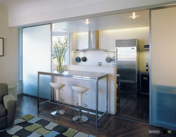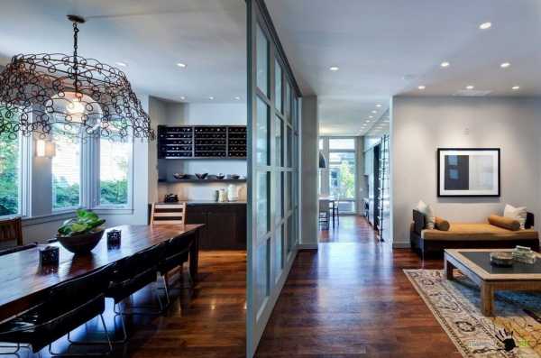 Аналогичные варианты перегородок из стекла, но только в раздвижном варианте можно использовать для отделения помещения кухни от столовой или гостиной.