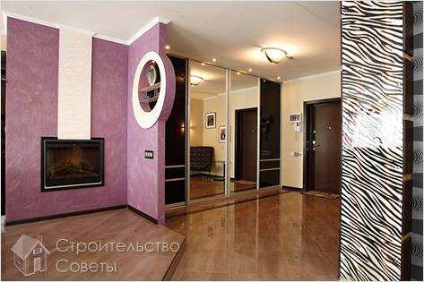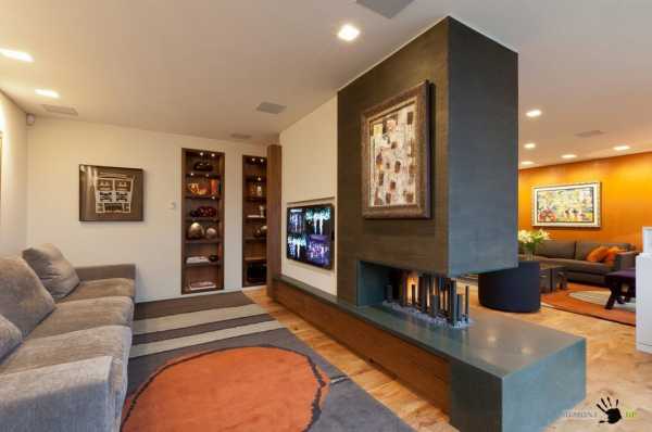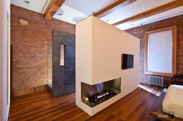 Одним из вариантов стационарной перегородки является сооружение для камина. Воздуховод для очага располагается в полости перегородки, для этого она должна иметь достаточное внутренне пространство. Преимущество такого камина, расположенного внутри широкой перегородки, это возможность наблюдать за огнем из различных точек помещения. Но есть и недостатки у подобных конструкций. Если для сооружения стеклянной или деревянной межкомнатной перегородки вам не требуется разрешение соответствующих служб, то с установкой камина не все так просто, в особенности с жилищами многоквартирных домов.