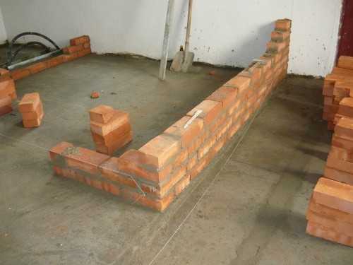 - Начинают выкладывать первый ряд кирпичей. Раствор при этом не используют. Важно строго придерживаться разметки, постоянно проверять ровность конструкции уровнем.