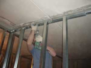 - В соответствии с разметкой на плитах перекрытия и стене закрепляют направляющий профиль.