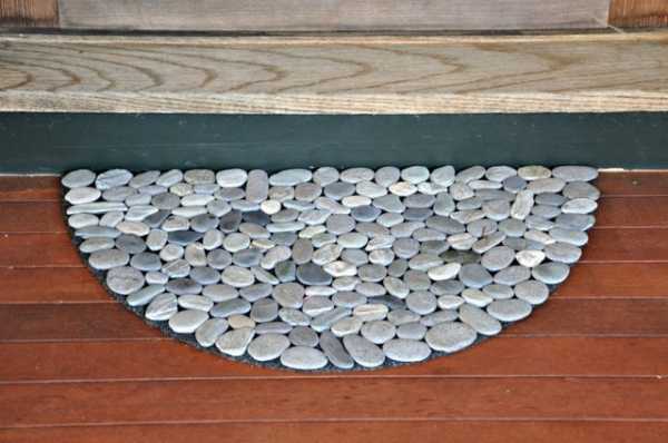 Напольный коврик также можно выложить и приклеить из речной гладкой гальки различных цветов. Основой может быть ковролин или другой материал. Клей наносят на каждый камень, поэтому рисунок нужно продумать заранее. Можно раскрасить коврик цветными красками, а сверху покрыть лаком.