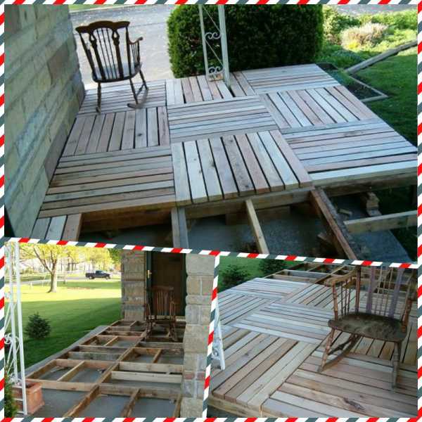 Да, вы правильно прочитали. Используя доски со строительных поддонов и брус — можно построить террасу за минимальный бюджет. Но если вы хотите сэкономить и свое время, то можно не углубляйся в проектировании основы из брусьев, а просто положить паллеты на землю, как показано на последней фотографии.