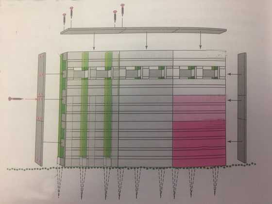 Следующим этапом будет сбор отдельных сторон ограждения. Для этого необходимо выложить поддоны в ряд таким образом, чтобы между собой соприкасались большие грани. Скрепляться они будут при помощи отрезанных частей и гвоздей. Аналогичные действия произвести для каждой стороны. Если ограждение планируется крупным, то в одной из них следует выпилить сквозное отверстие под вход. На этом предварительная сборка заканчивается.