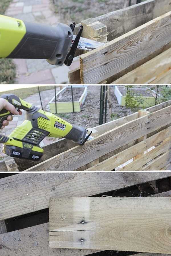 Для начала следует рассчитать нужное количество паллетов и заранее их заготовить. От каждого следует отпилить примерно треть. Разрез проводится перпендикулярно ножкам паллета.