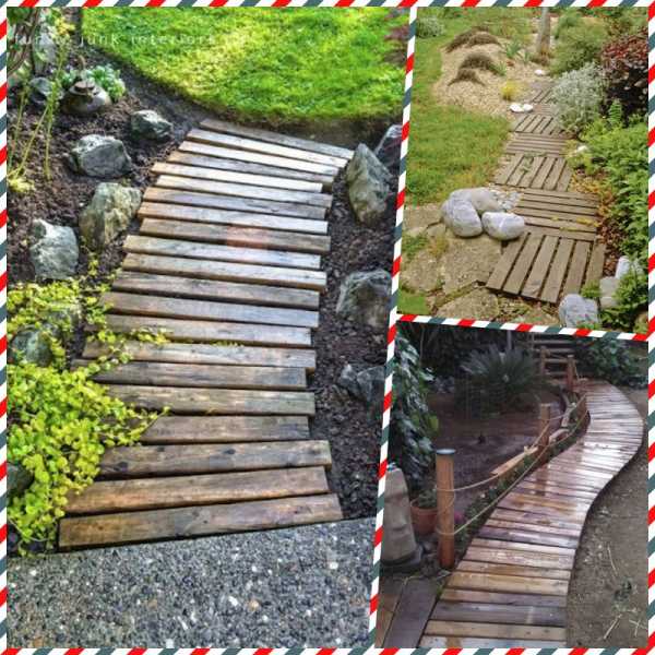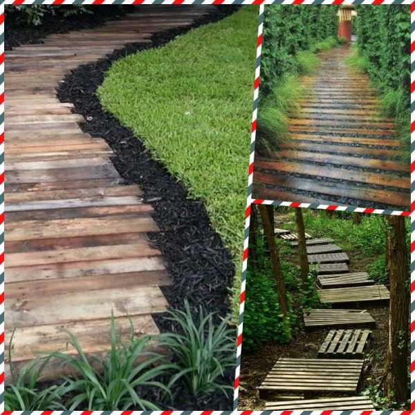 Наши идеи использования строительных поддонов еще не исчерпаны! Из удаленных досок с поддонов можно выложить оригинальные дорожки в саду…