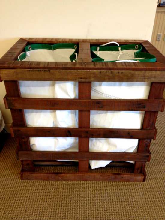 Обратите внимание, как аккуратно реализована идея, суть которой заключается в создании, грубо говоря – ящика с двумя отсеками, а в каждом из отсеков установлен бельевой мешок. Таким образом, можно сортировать нестиранные вещи, в одном мешке складировать повседневные вещи, в другой складывать постельное белье или полотенца.