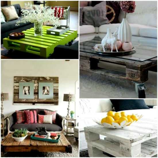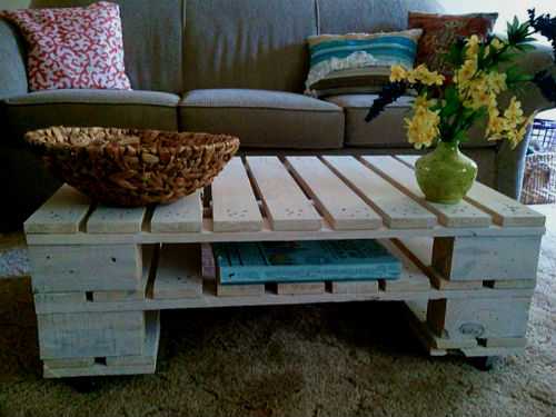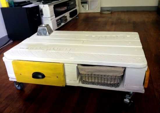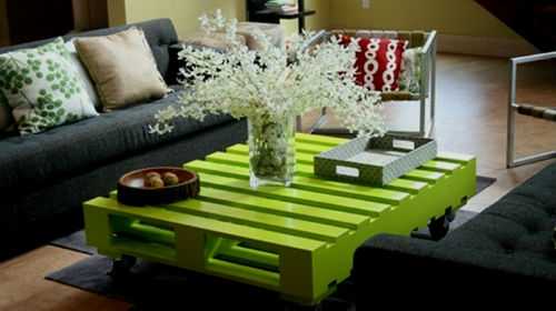 Очень прост в воплощении столик из поддонов, для удобной его последующей эксплуатации в нижней части необходимо закрепить крутящиеся колесики. Для большей эстетичности его можно покрасить и на столешницу уложить закаленное стекло.