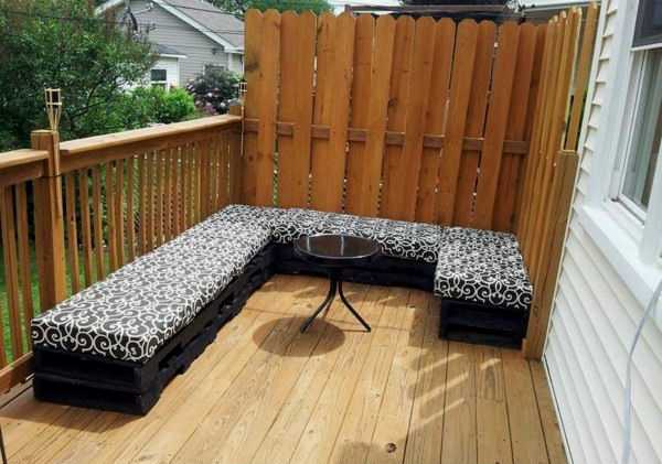 Необычной идеей станет сооружение скамьи из деревянных поддонов. Довольно практичное и нетрудное в исполнении решение. Их для простой вариации понадобится три штуки.