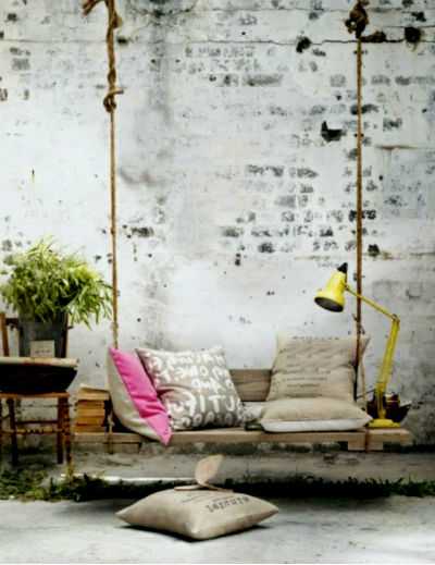 Отличное решение для дачи – подвесной уличный диван (качели или шезлонг). Если на участке прорастает прочное ветвистое дерево, то на нем вполне можно закрепить прочные канаты, на которые и подвесить качели.