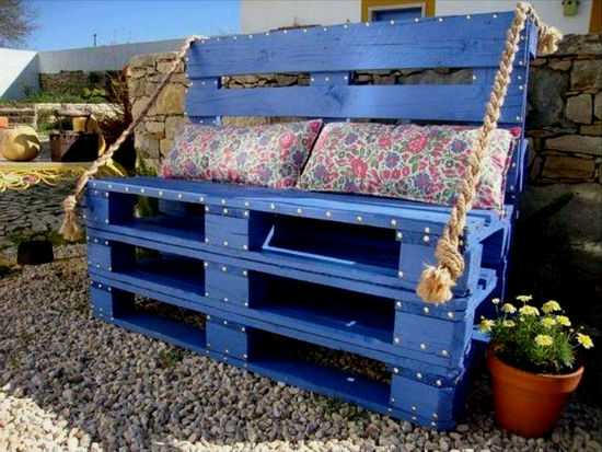 Скамейка в саду просто обязана присутствовать, ниже можете посмотреть различные примеры скамеек из паллет, особенно эффектно смотрится синяя лавочка с канатным декором.