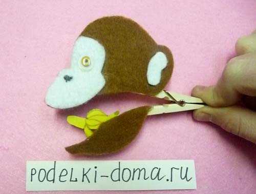 Приклейте банан на нижнюю часть прищепки, слегка отогнув его от прищепки, что бы он не цеплялся за верхнюю часть головы при открывании.