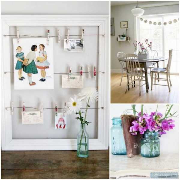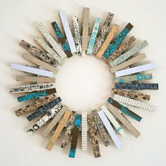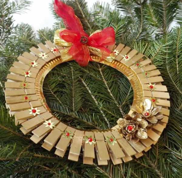 Перед нами универсальная конструкция для снимков, записок, памятных мелочей, а так же многоразовый каркас для праздничного декора. Сделать нечто подобное совсем несложно: берём набор деревянных прищепок, а так же пару метров ленты и будущий каркас — деревянные пяльца или фоторамку. Собираем всё, что будет радовать глаз, и начинаем в свободном порядке крепить это прищепками к основе. Главное не переборщить и выдержать цветовую гамму. Теперь пропускаем через наш «венок» ленту и завязываем большой бант, и можно вешать — хоть на стену, хоть на дверь.
