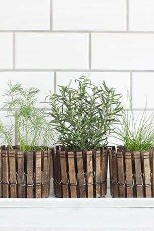 Свежо и оригинально смотрится: плоская консервная баночка (от сардин, икры, какого-нибудь «вискаса») и обычные бельевые прищепки превращаются в симпатичный горшок (или же в стаканчик для карандашей).