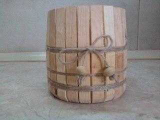 Жестянку сперва необходимо хорошенько вымыть и высушить, а так же удалить бумажную этикетку, если таковая имеется. Теперь плотно сажаем на края банки деревянные прищепки (пластиковые не образуют ровную стенку, а будут торчать в стороны). Внутрь можно поместить небольшие домашние растения или срезанные цветы в стакане.