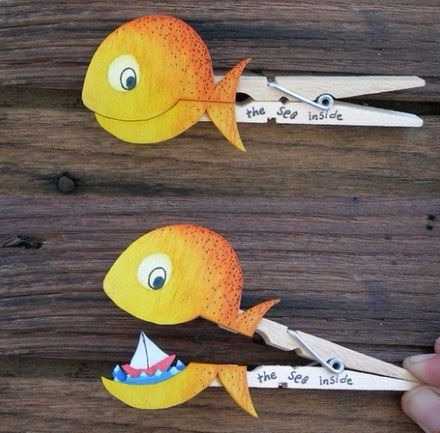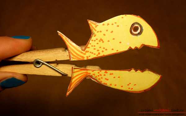 На прищепку на каждую частичку приклеиваем по половинке рыбки, да так, чтоб, когда прищепка будет закрыта, рыба смотрелась цельной.
