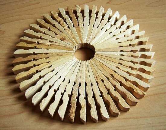 Подставка под горячее – вещь всегда актуальная и в доме нужная! Для этих целей лучше использовать деревянные прищепки, так как пластик может нечаянно расплыться под «пылкой» сковородкой или кастрюлей. Техника изготовления элементарна: помогите ребёнку вынуть из прищепок пружинки, а уж склеить их веером он запросто сможет сам.