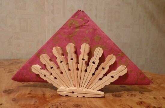 Такая салфетница неплохо смотрелась бы в компании самовара: есть в ней что-то стринно-русское, что роднит её с резными деревянными теремами… Подумать только – а ведь совсем недавно она была прищепками!