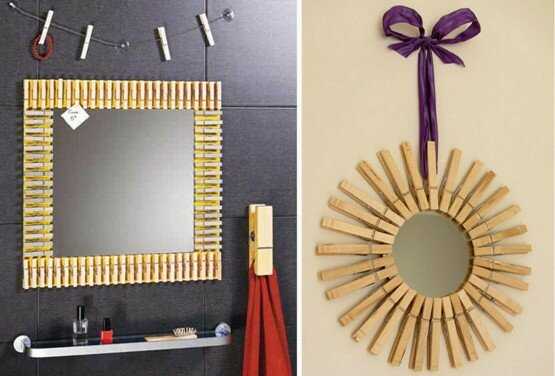 Для декора в стиле «эко» кроме самого зеркала нам понадобятся деревянные прищепки. Их можно просто прицепить по краям, а можно усложнить себе жизнь и, вынув из прищепок пружинки, основательно «слепить» раму с помощью клея для зеркал, плотного картона и акриловой краски.