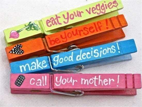 Цветные (раскрашеннные) прищепки с надписями маркером могут служить яркими и оригинальными «напоминалками», дополнять записки на холодильнике и вообще вносить немного юмора в наш привычный быт. У нас на фото, например, разноцветные «мотиваторы» советуют принимать хорошие решения и правильно, напоминают о необходимости быть собой и позвонить маме.
