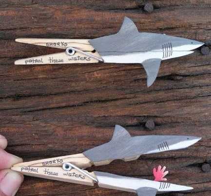 Все проще некуда. Рисуете, к примеру, акулу, если точнее ее переднюю часть, после вырезаете и разрезаете пополам по длине. Клеите половинки к частям прищепки, а потом рисуете, вырезаете и тоже клеите к прищепке руку. Нажимаем на прищепку и видим руку в акульей пасти.