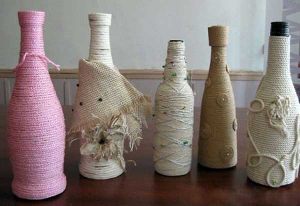 Еще один способ украсить пустую бутылку — оклеять ее шпагатом или мешковиной. При желании можно также использовать бусины и другие элементы декора.