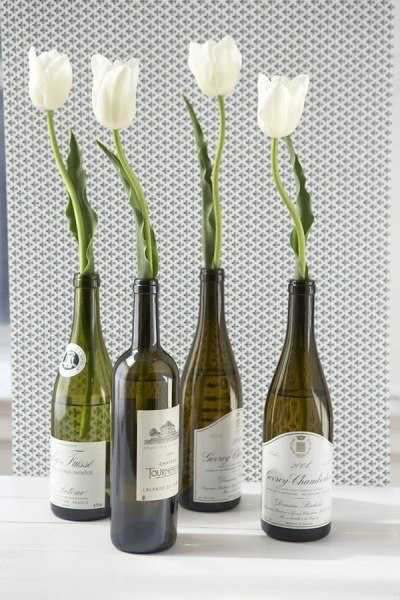 Бутылку из-под вина и шампанского можно превратить в отличную вазу для цветов.