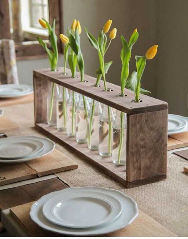 Первое, что приходит в голову – вазы из стеклянных бутылок. Грамотно оформленная композиция будет выглядеть действительно аккуратно и красиво: