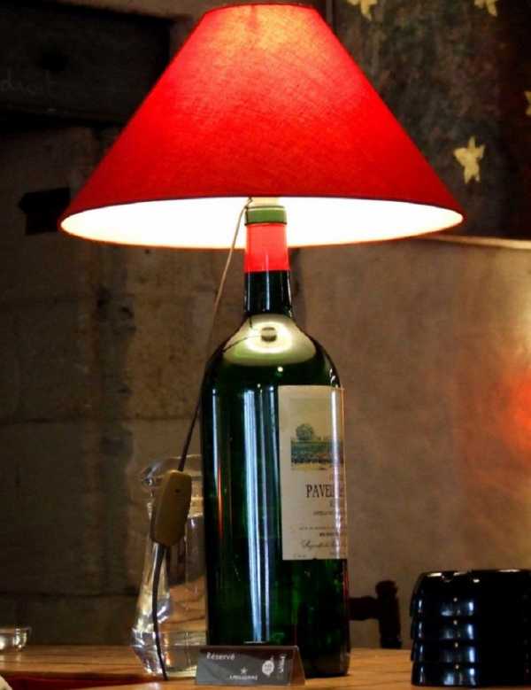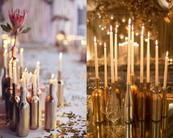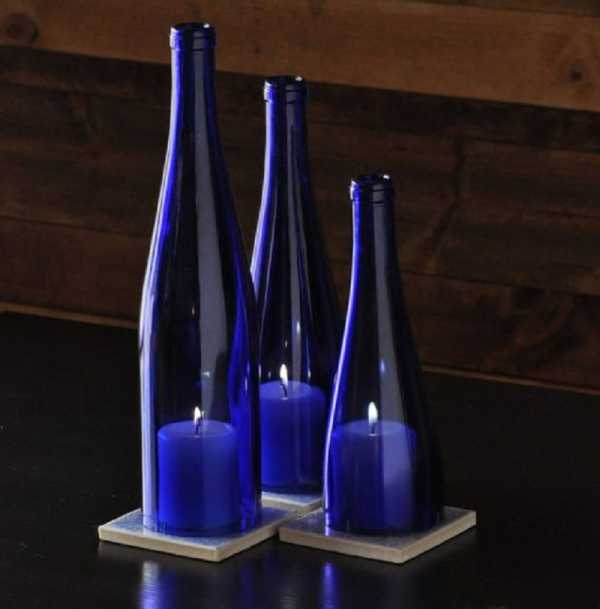 Следующий наиболее популярный вариант утилизации – светильник или подсвечник из стеклянной бутылки. Самый простой подсвечник: закупорить горлышко бутылки и на него установить свечу. На фото ниже представлен весьма интересный способ использования бутылки в качестве подсвечника – предварительно стеклянную бутылку окрасили в цвет свечей матовой краской:
