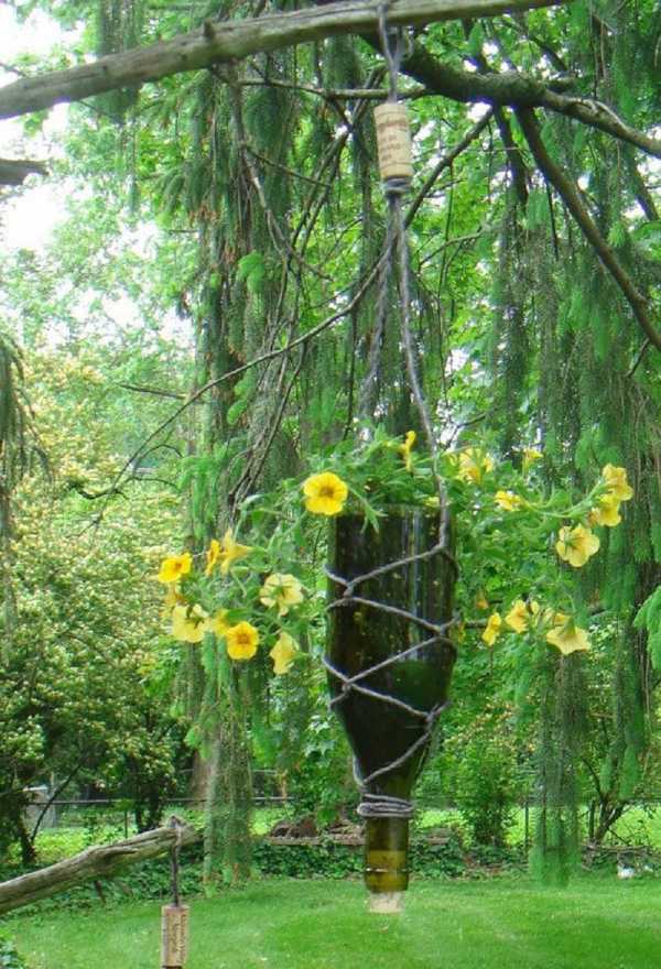 Его можно сделать подвесным. Тогда будет казаться, будто бы бутылка – часть цветка, которая растет вместе с ним.