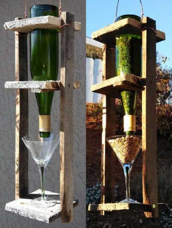 Из стеклянной бутылки можно сделать кормушку для птиц: