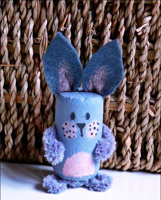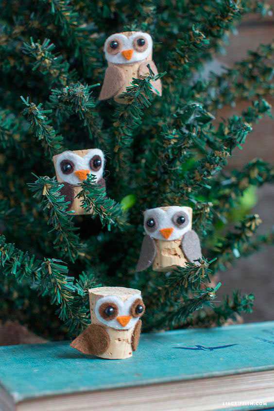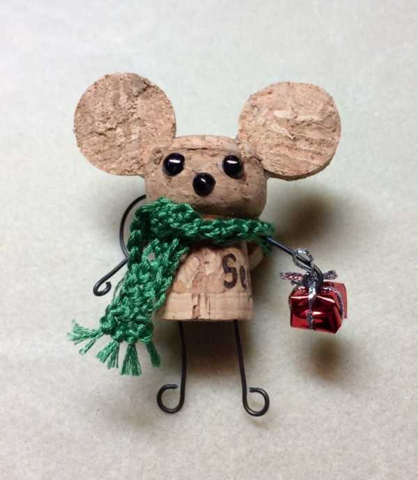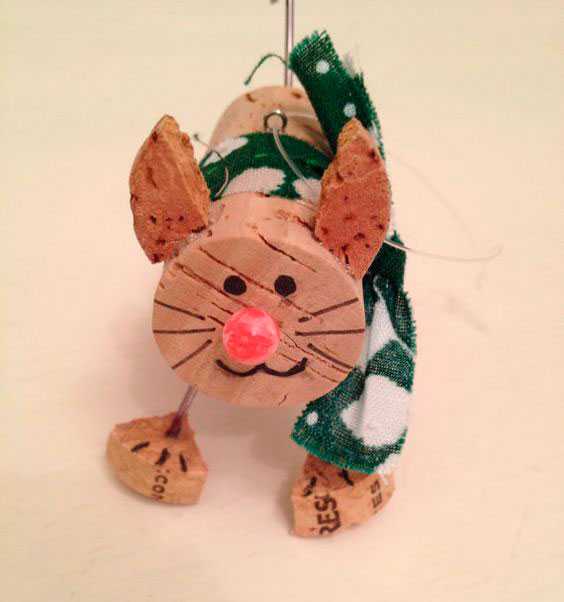 Пробку можно взять за основу для елочных игрушек. Например, чтобы получился олень, к цилиндру достаточно прикрепить уши, глаза и нос из фетра, рожки из декоративной проволоки и колечко с бусиной в нижней части. К пробке прикрепить деревянные бусины, нарисовав на них глаза и улыбку, из бантиков сделать крылышки, и получатся бабочки или пчелки, если раскрасить основу в черные и желтые полоски.