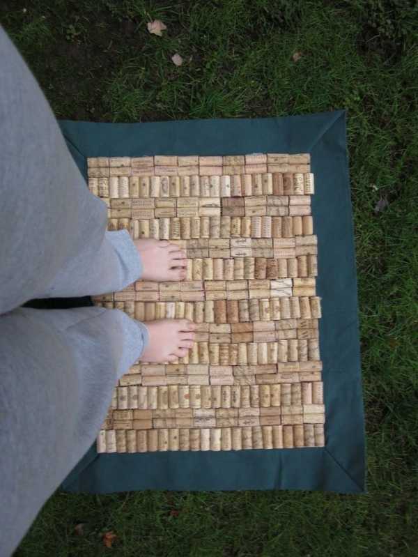 Можно разрезать пробки на равные по толщине кружочки и также создать из них коврик. Если цилиндры будут иметь разную толщину, коврик станет отличным массажером для ног.