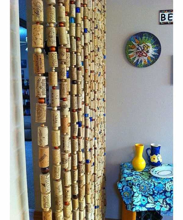 Из винных пробок получаются симпатичные шторы для дверных проемов, которые используют вместо межкомнатных дверей в маленьких квартирах и не только.
