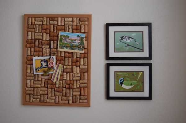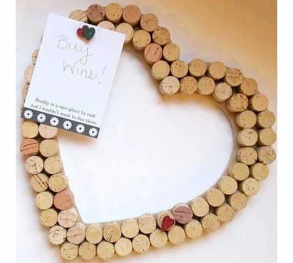 Интересная и довольно простая в исполнении идея использования пробок — это доска для заметок. Приклейте половинки или целые пробки на подложку необходимого размера. В качестве основы можно также использовать рамку для фотографии. Кнопками или булавками вы легко закрепите на такой доске различные заметки, фотографии и напоминания.