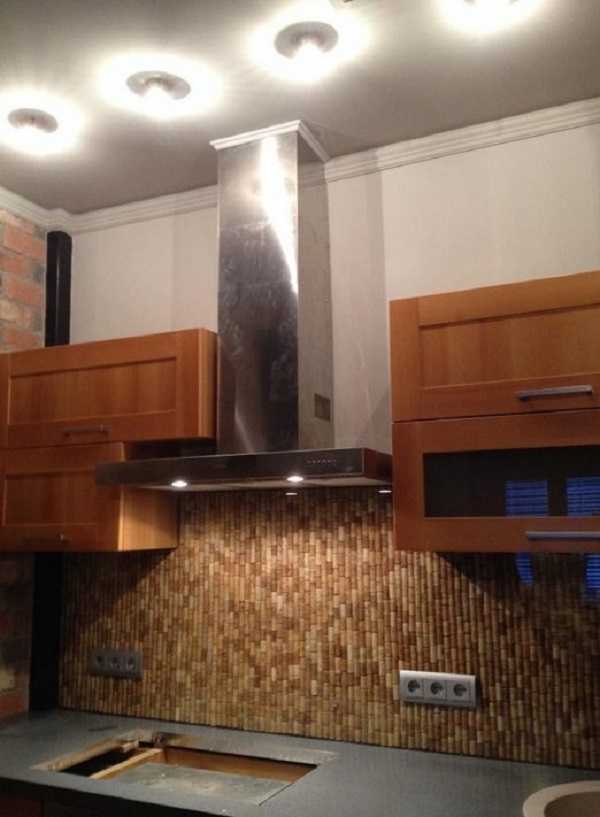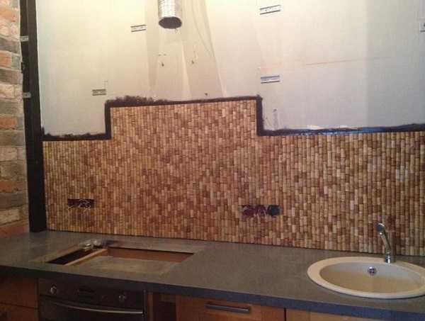 Как и в случае с фартуком для кухни, пробки приклеиваются разрезанные пополам и на заранее покрашенную в темный цвет поверхность.