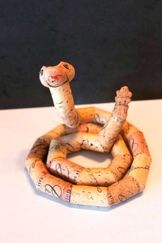 Кружки нанизать на длинную нить, а из одной пробки сделать голову с глазами и высунутым язычком. Получится игрушка змейка.