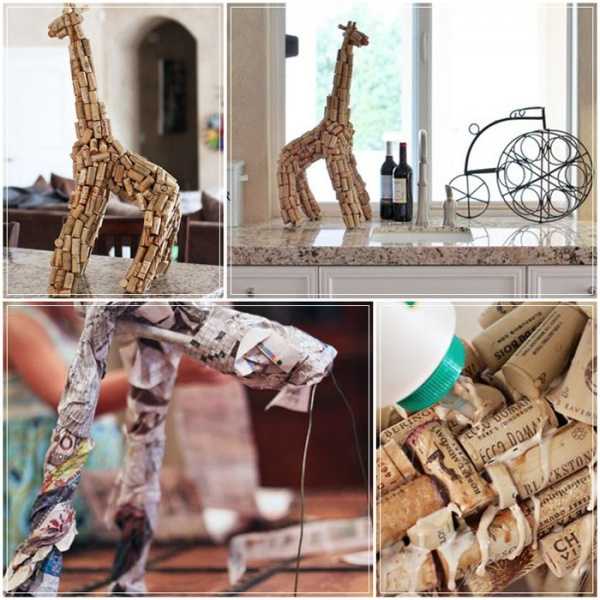 Глядя на этого грациозного жирафа, служащего украшением интерьера, кажется, будто над ним работали несколько опытных инженеров. На самом деле, делается он элементарно: проволочный каркас оклеивается бумагой, а затем на него «сажают» винные пробки. Главное – не жалеть клея, чтобы конструкция получилась не только красивой, но и прочной.