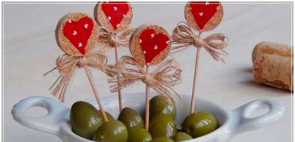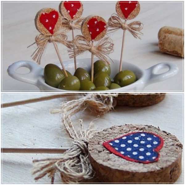 Для изготовления шпажек нам потребуются нарезанные на кружочки винные пробки, зубочистки и элементы их украшения: бусины, тесемки, бечевка или нить в несколько сложений, ткань для сердечек, клей и всё, что можете применить для оживления шпажек. Гости оценят ваше творчество по достоинству.