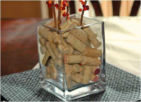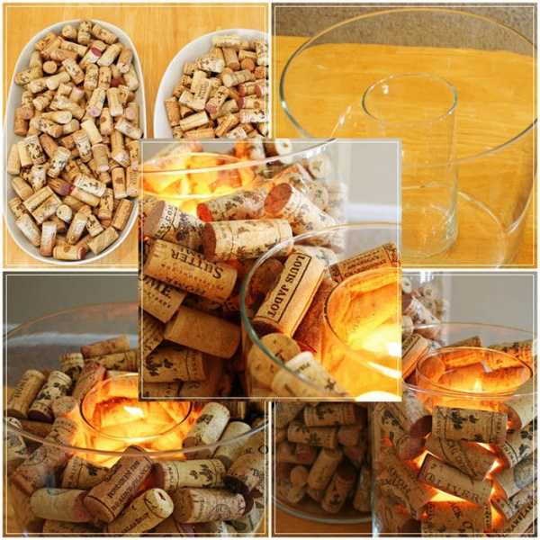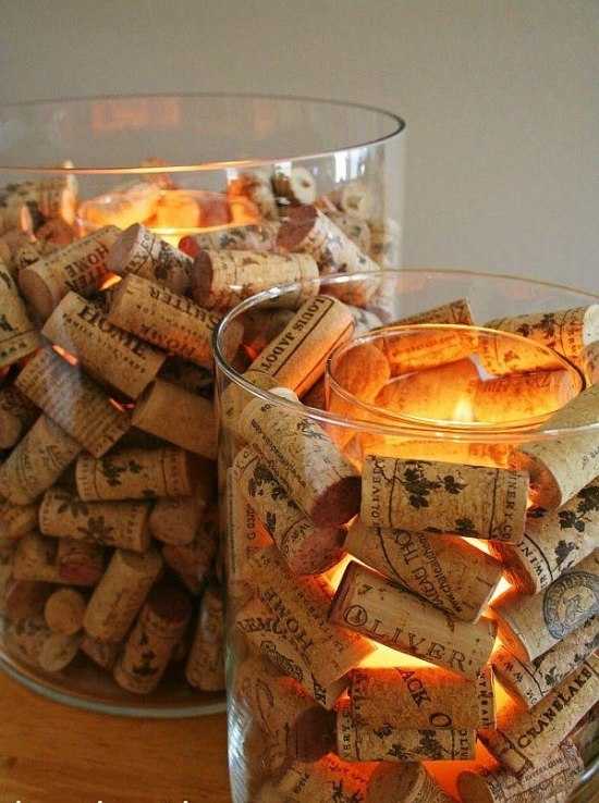 Совсем просто насыпать в подходящую емкость пробок и добавить свечи — оригинальный светильник готов!