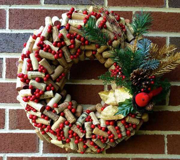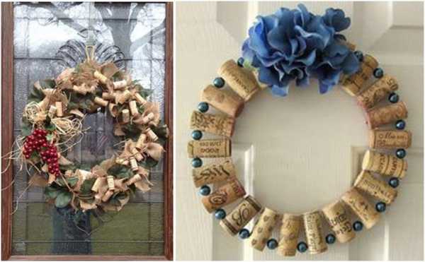 Вот такие красивые венки можно сделать при помощи винных пробок. Технология довольно проста: делаем каркас и обклеиваем его пробками. При этом от того, как вы их расположите, будут зависеть вид и «настроение» венка. Такими венками можно украсить дом на Новый год и другие праздники. Один из мастер-классов по изготовлению венков из винных пробок вы найдете здесь.