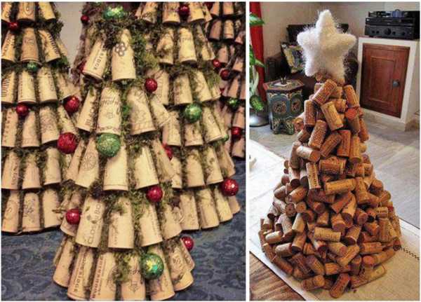 Всевозможные ёлочки, новогодние игрушки и фигурки оленей тоже можно выполнить с помощью винных пробок. Для этого потребуются клей, бумага, краски и декоративные элементы. Довольно высокую елочку можно смастерить с помощью конусовидной основы, на которую наклеивают бумагу, а поверх нее – пробки круглым основанием, чтобы получились иголки.